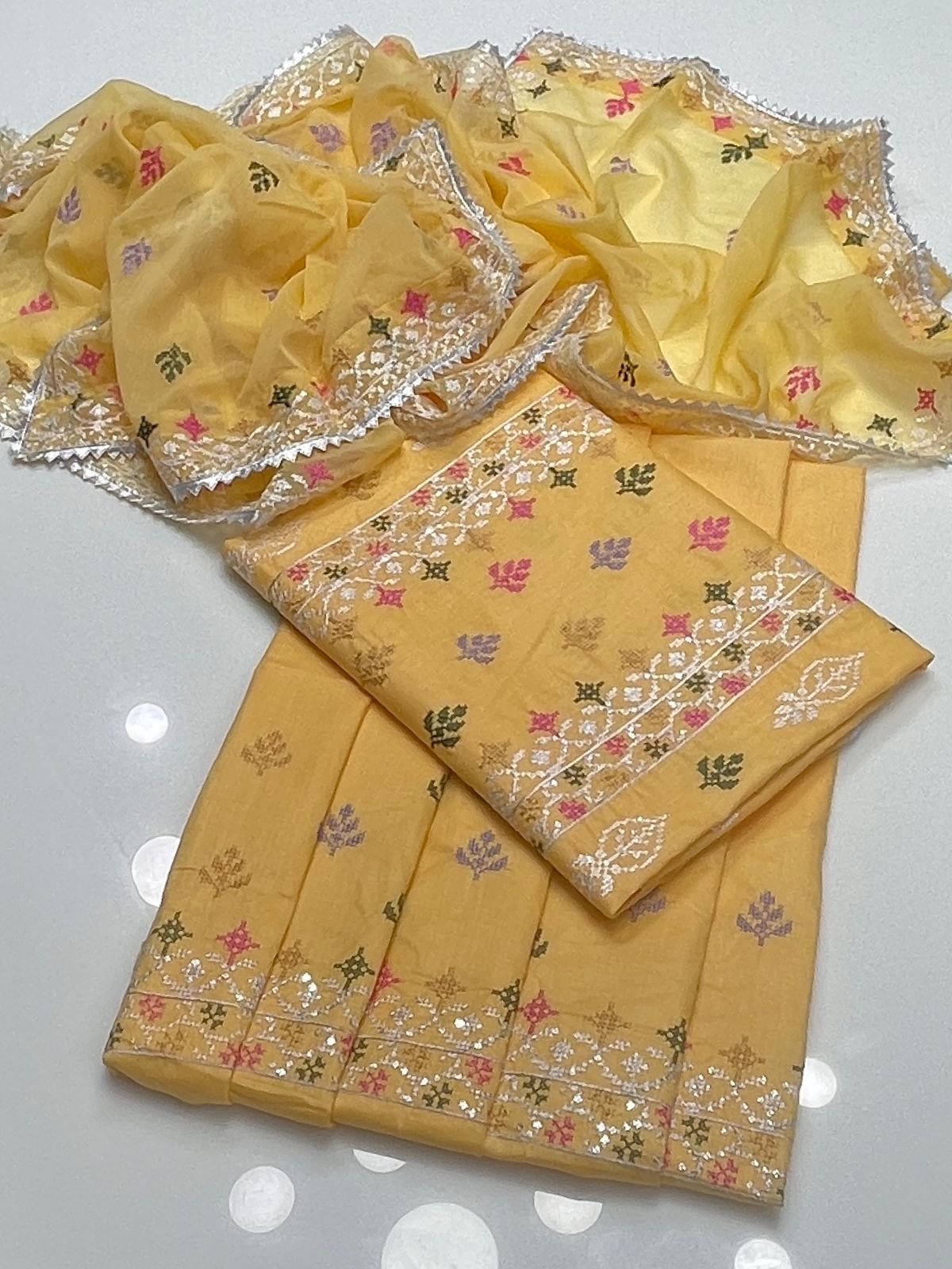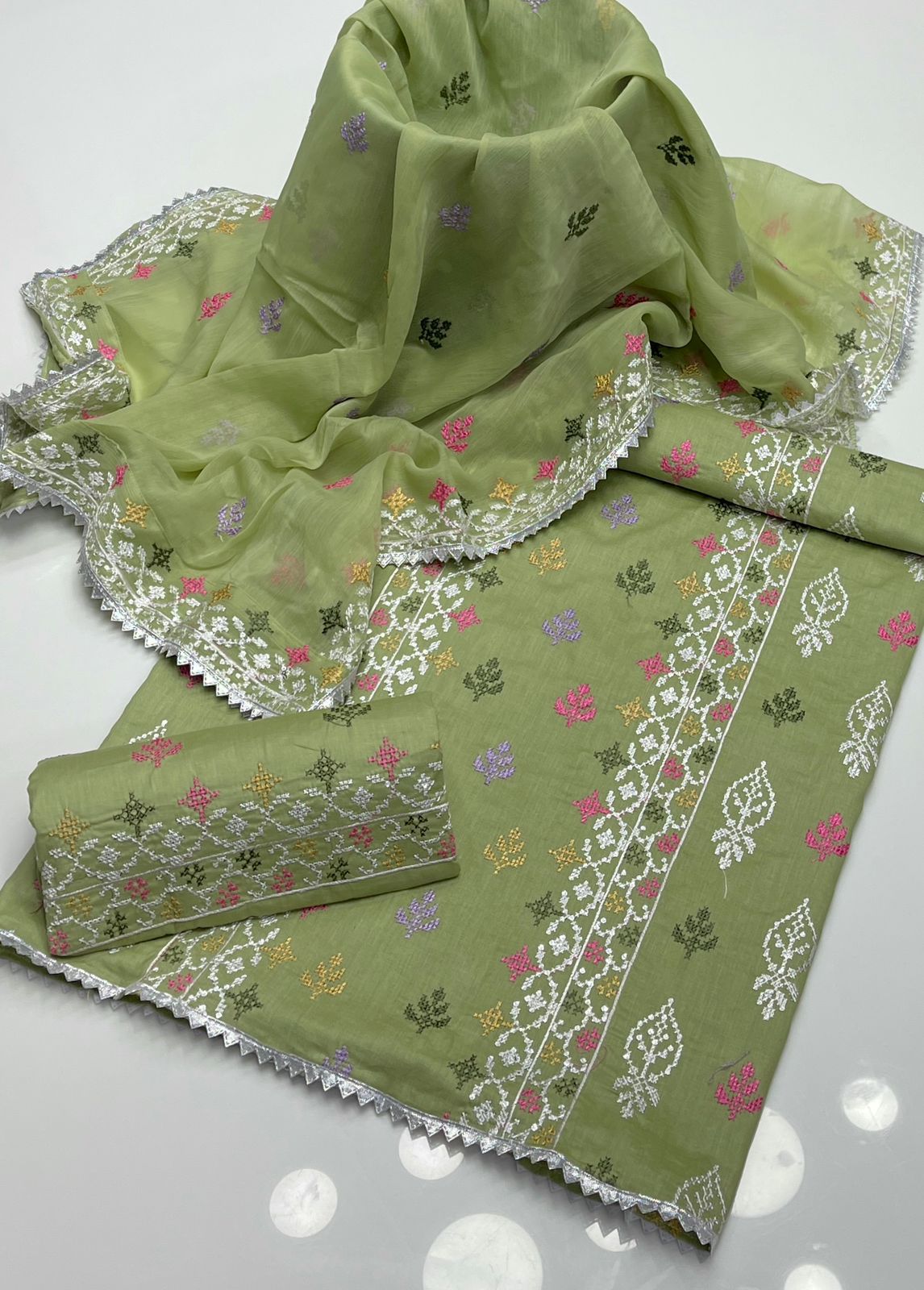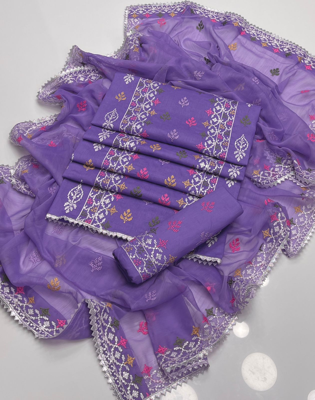 • Dupatta : chaifoon sequence embroidered 4 side borders with lace